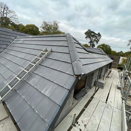 The client chose a Sikaplan warm roof system for the flat roof, featuring a 150mm insulation build-up and the crucial vapour control layer. For the pitched roof areas, Marley Edgemere interlocking slate tiles have been installed, providing complete dry systems for the ridges, verges, valleys, and hips.